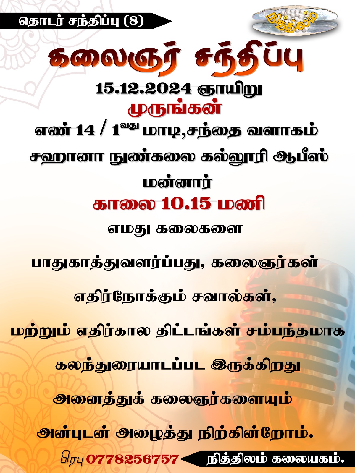 எட்டாவது சந்திப்பு 15.12.2024 அன்று காலை 10.15 மணியளவில் மன்னார் மாவட்டத்தில் உள்ள முருங்கனில் சந்தை வளாகம் எண் – 14, 1 ஆம் மாடியில் அமைந்துள்ள சஹானா நுண்கலைக் கல்லூரிக் காரியாலயத்தில் நடைபெற்றது. அங்குள்ள கலைஞர்களின் கருத்துகளும் கேட்டறியப்பட்டது.