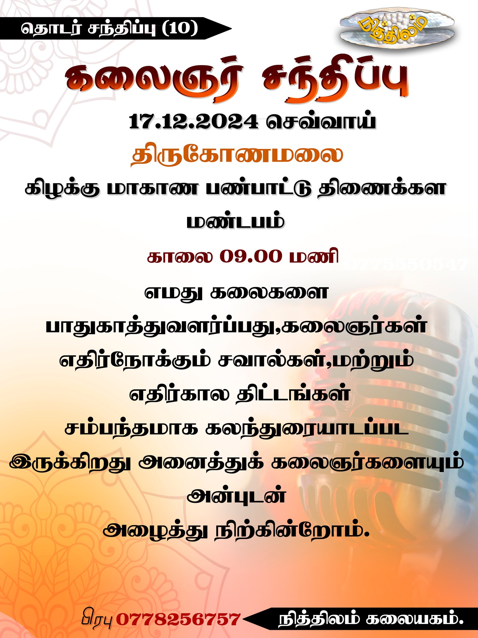 பத்தாவது கலைஞர் சந்திப்பு 17.12.2024 அன்று காலை 9 மணியளவில் திருகோணமலையிலுள்ள கிழக்கு மாகாண பண்பாட்டுத் திணைக்கள மண்டபத்தில் நடைபெற்றது. கலைஞர்கள் கருத்துகள் கேட்டறியப்பட்டது.