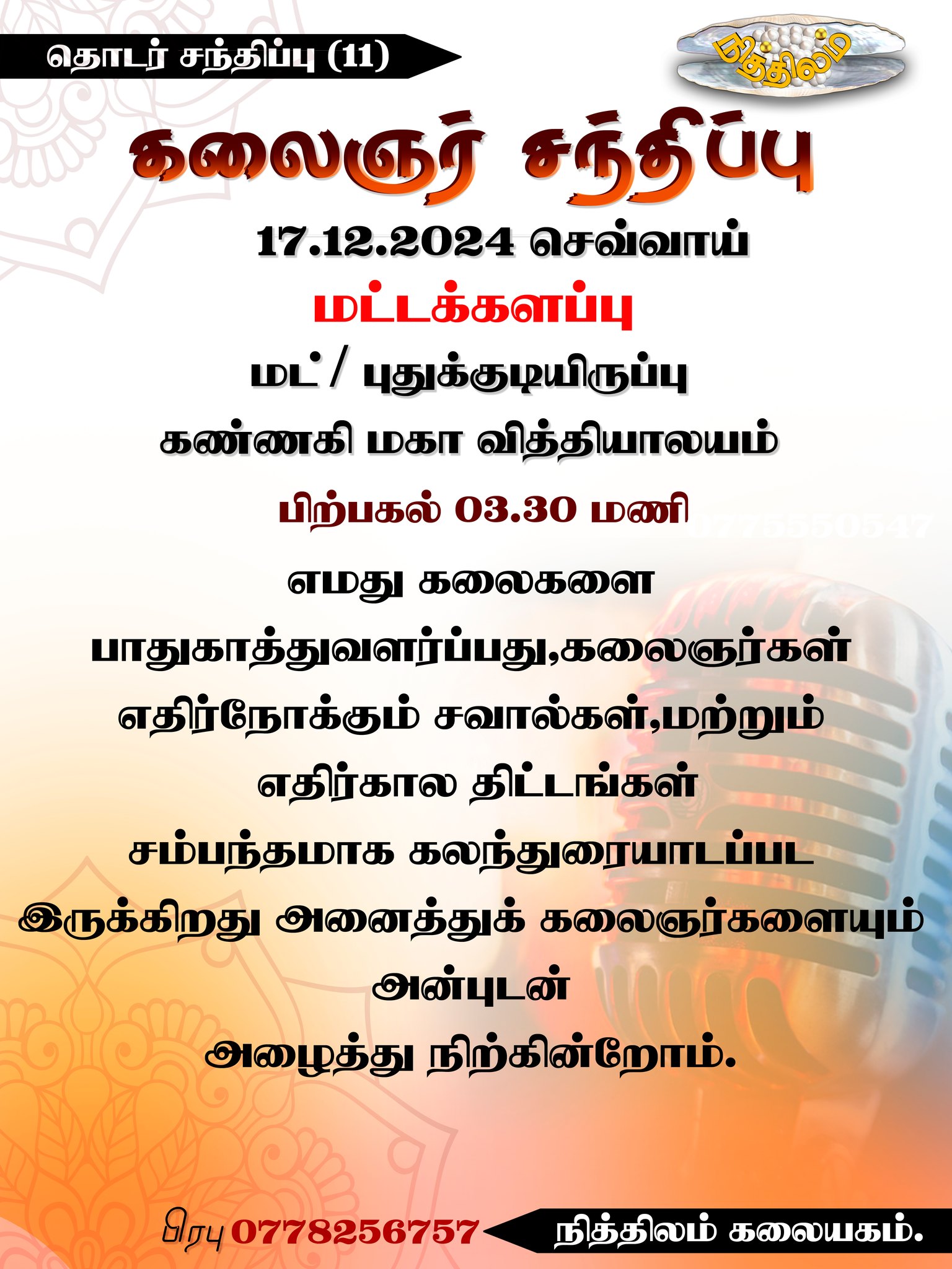 பதினொராவது சந்திப்பு 17.12.2024 செவ்வாய்கிழமை அன்று மாலை 3.30 மணியளவில் மட்டக்களப்பு மாவட்டத்திலுள்ள புதுக்குடியிருப்பு கண்ணகி மகாவித்தியாலயத்தில் நடைபெற்றது.